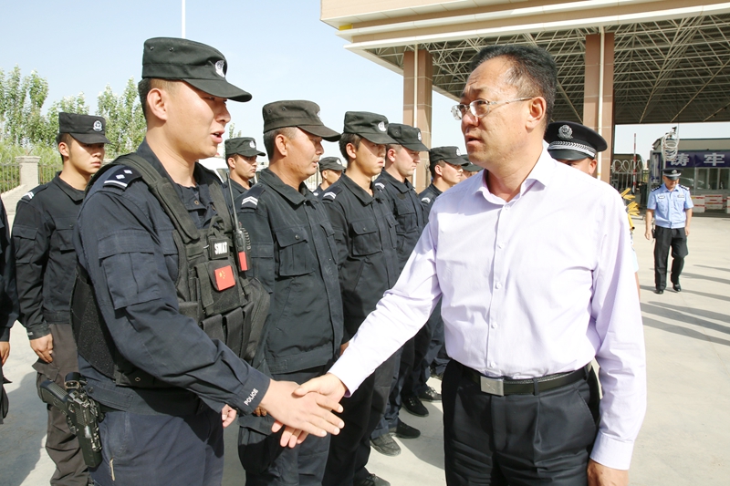 图为 在国道315若羌县治安卡点,州党委书记李刚向奋战在维稳一线的民警表示感谢